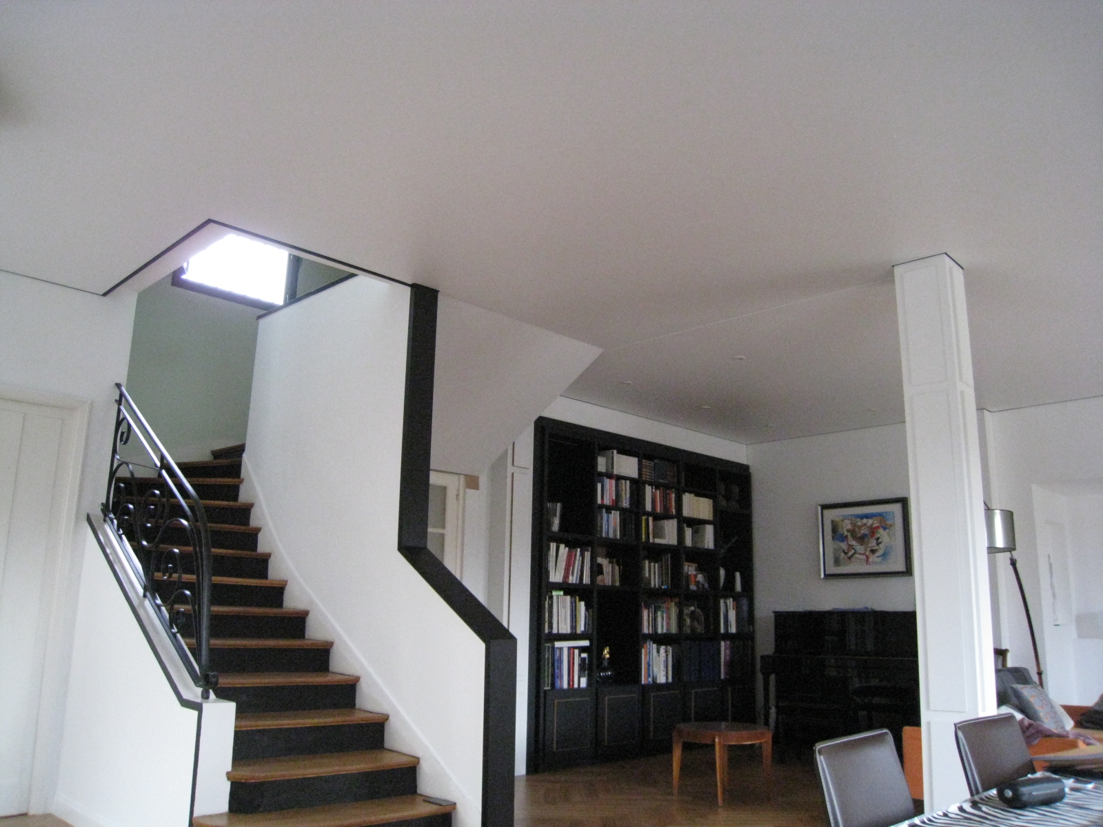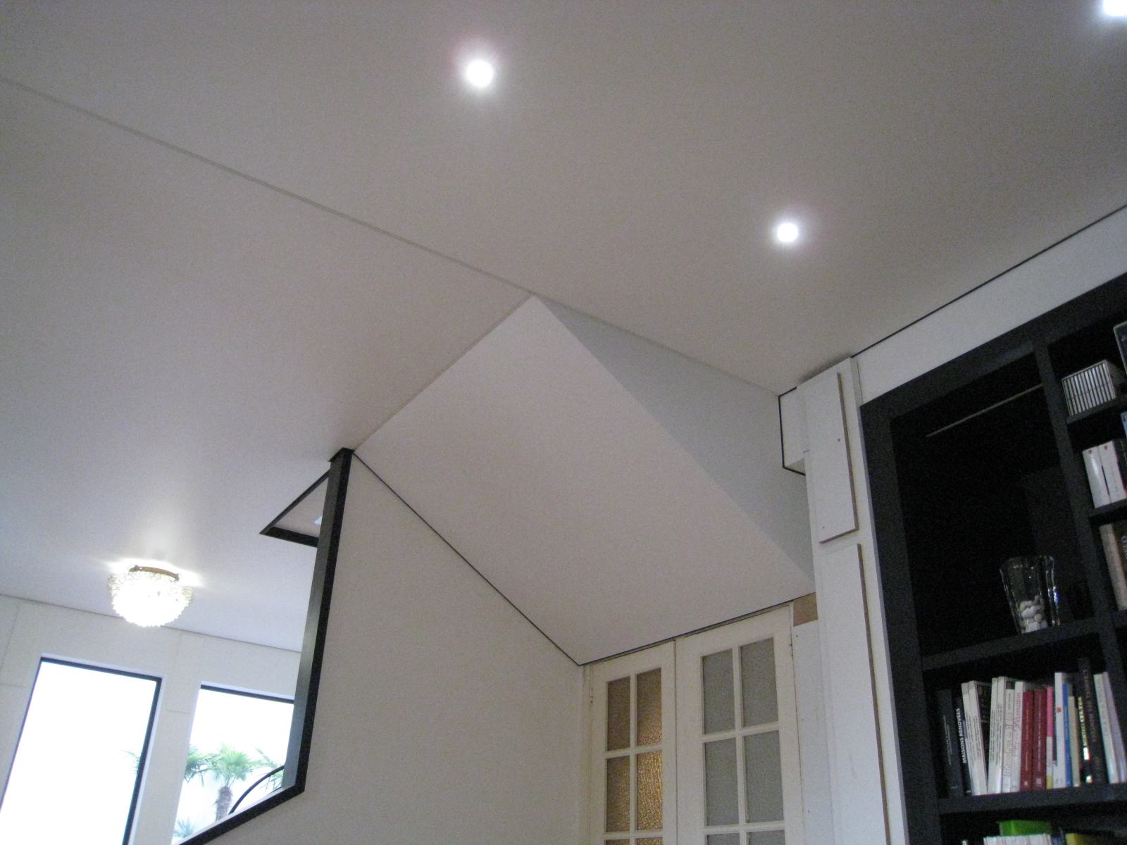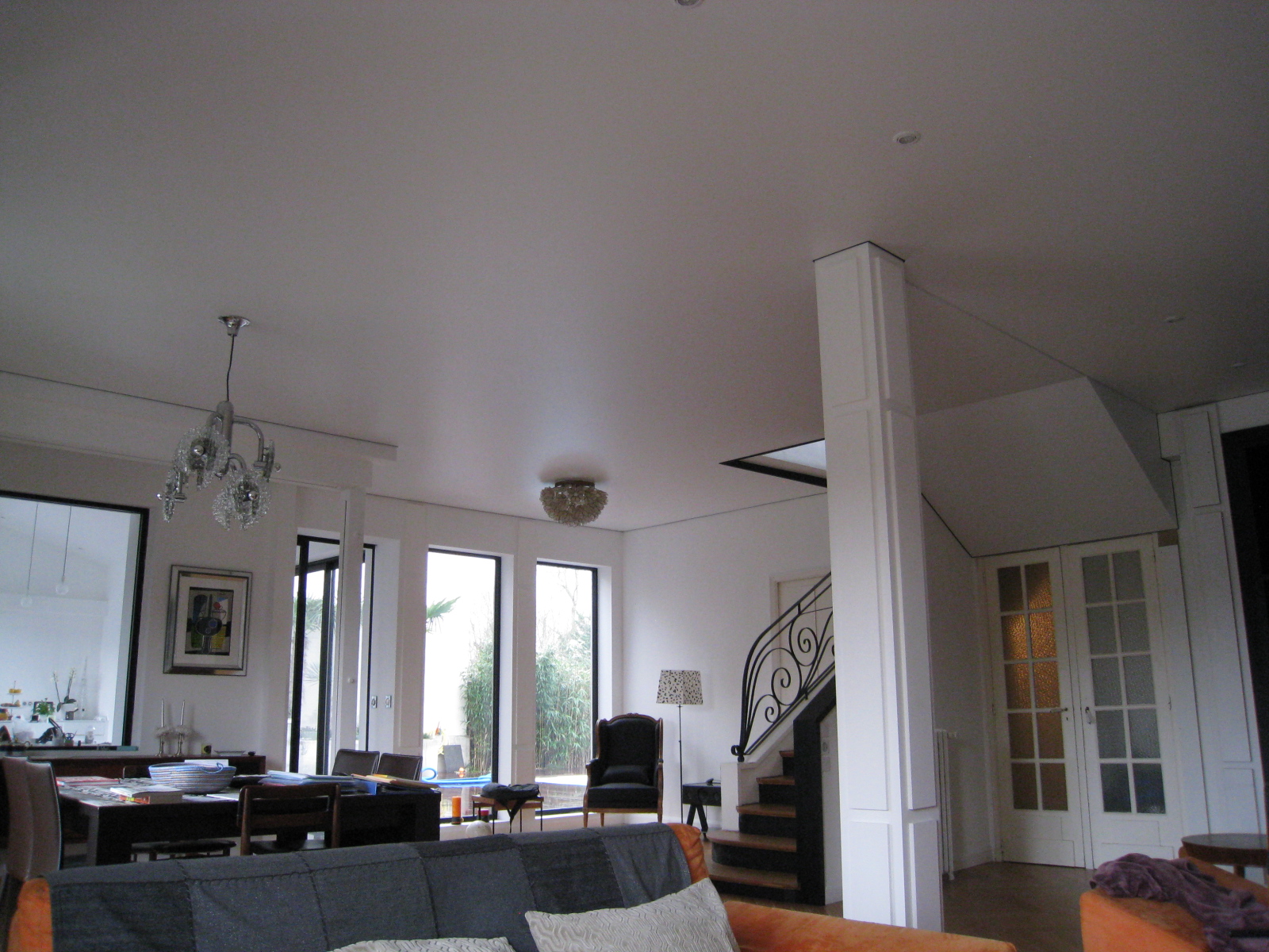 Aprés avoir supprimé la totalité des cloisons pour bénéficier d une piéce plus grande 60 m2, les clients ont opté pour un Plafond Tendu Extenzo afin d éviter le spectre des joints de plaque de plâtre dans ce volume traversant.
