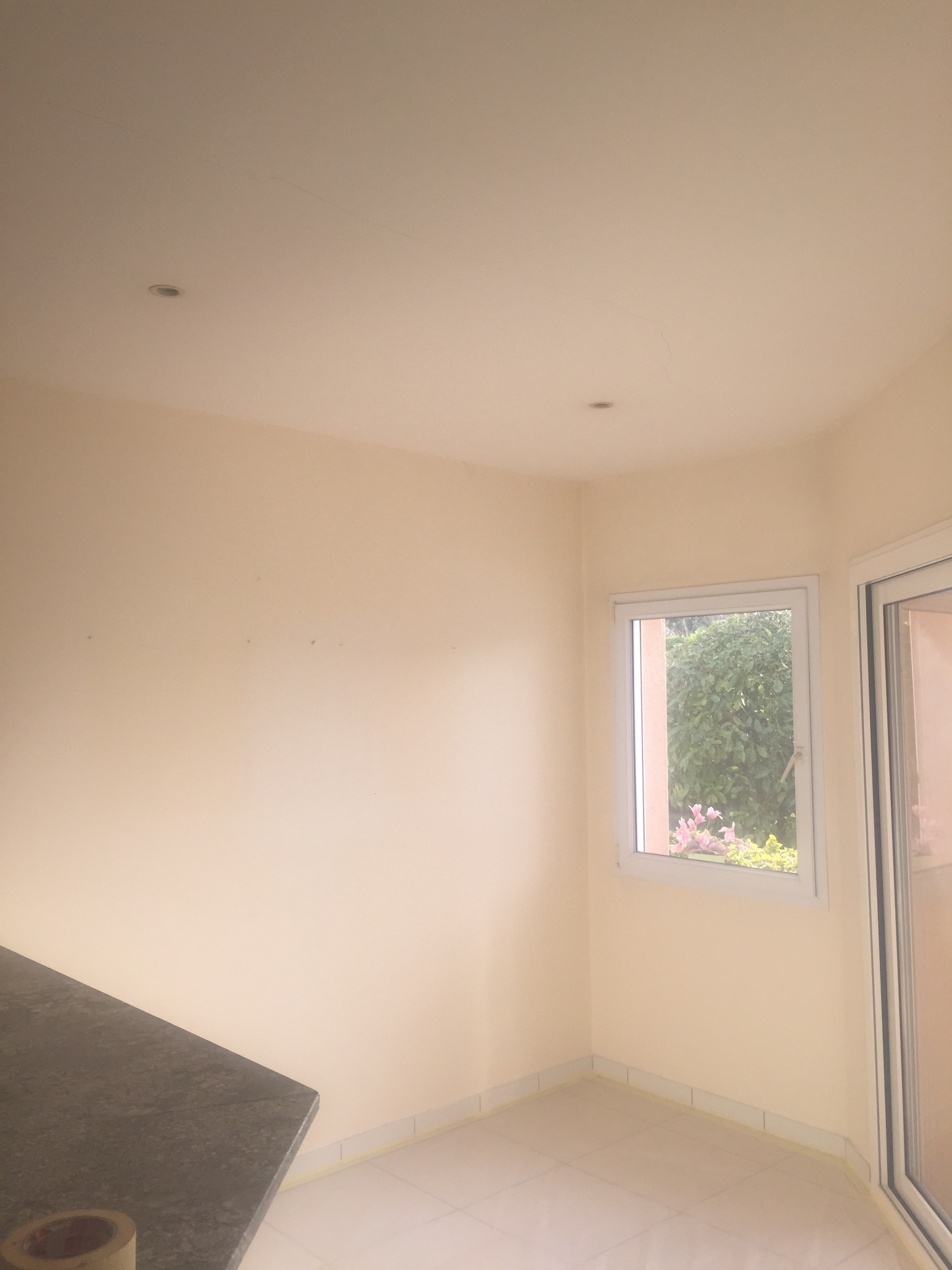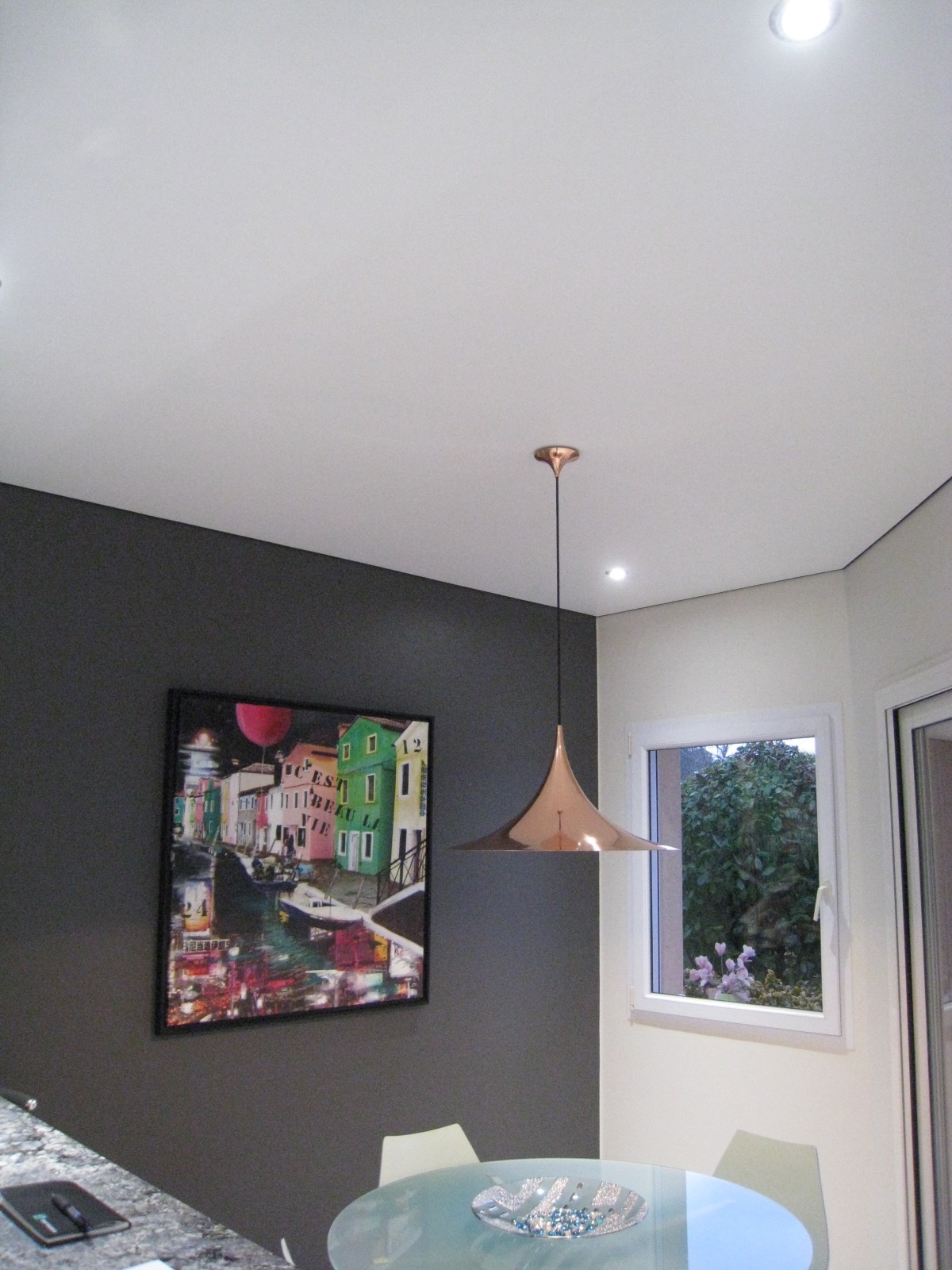 Ici rénovation des murs avec les peintures Confort 2000 de Montauban, Plafond Tendu Satiné Extenzo & éclairages spots leds & luminaire.