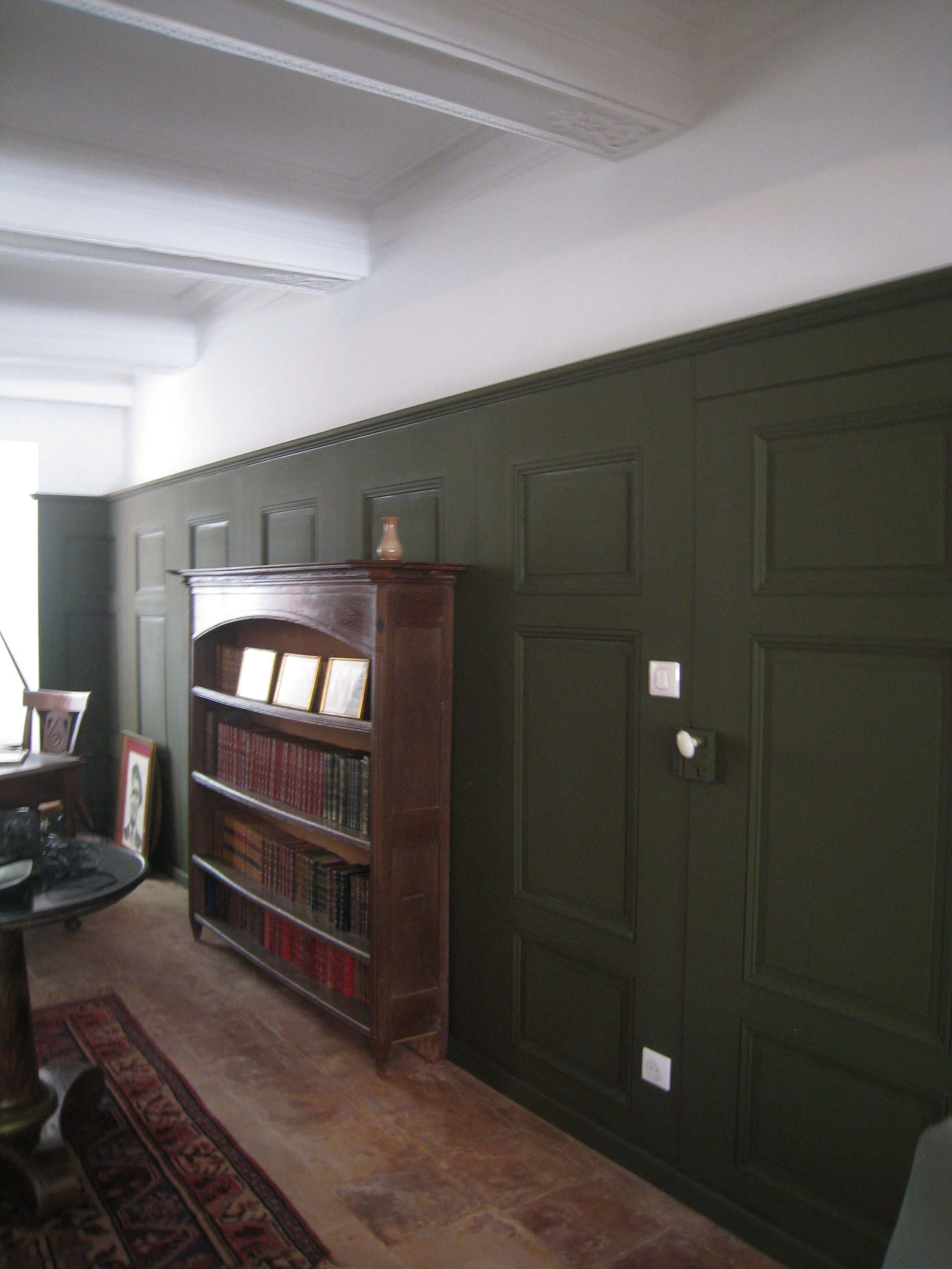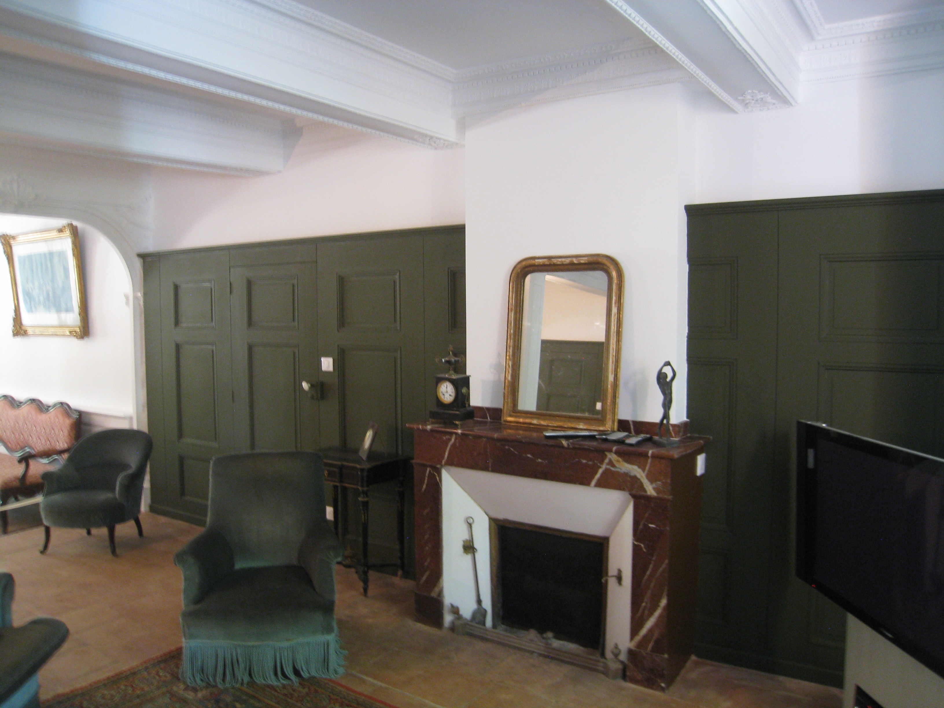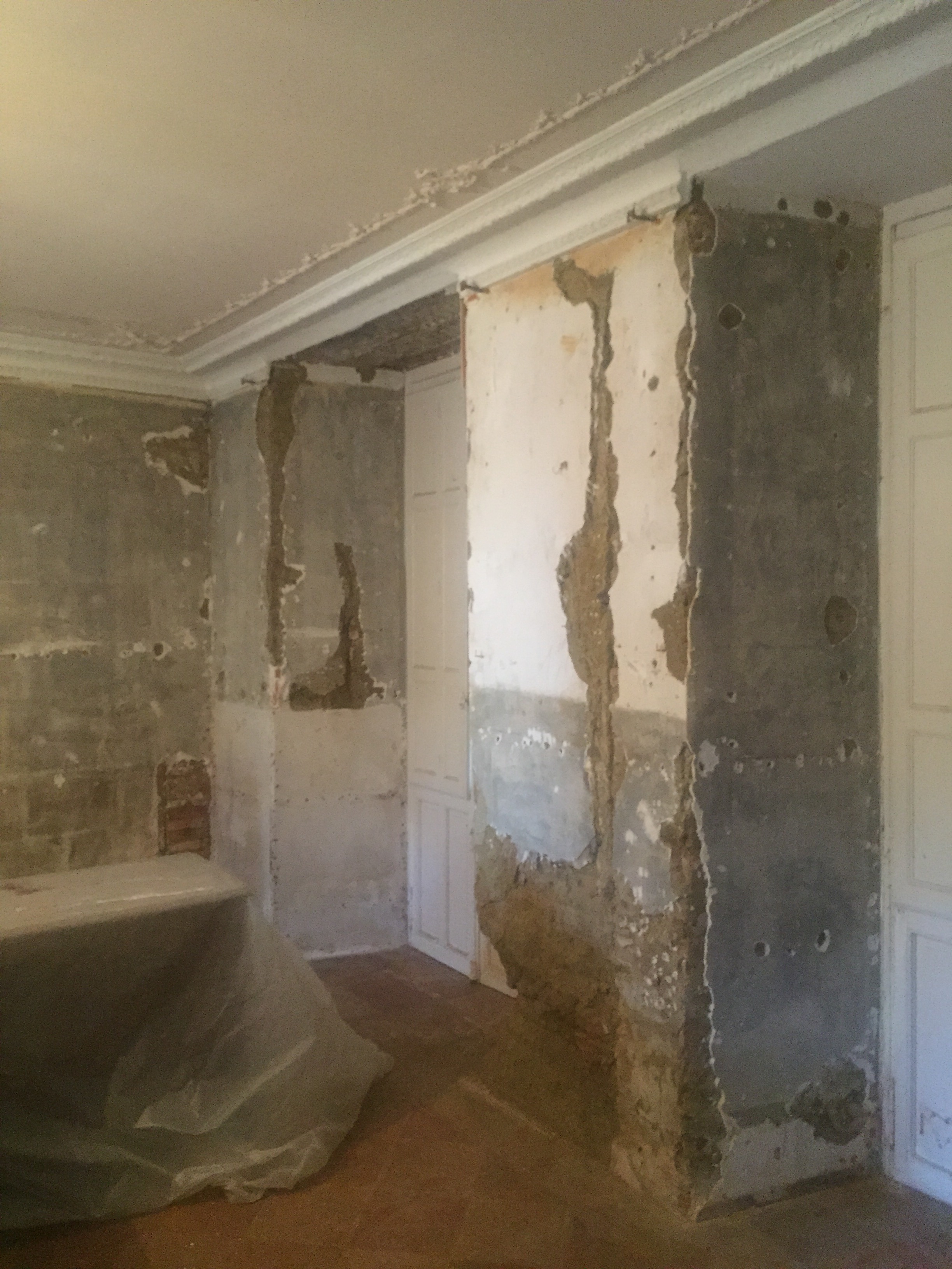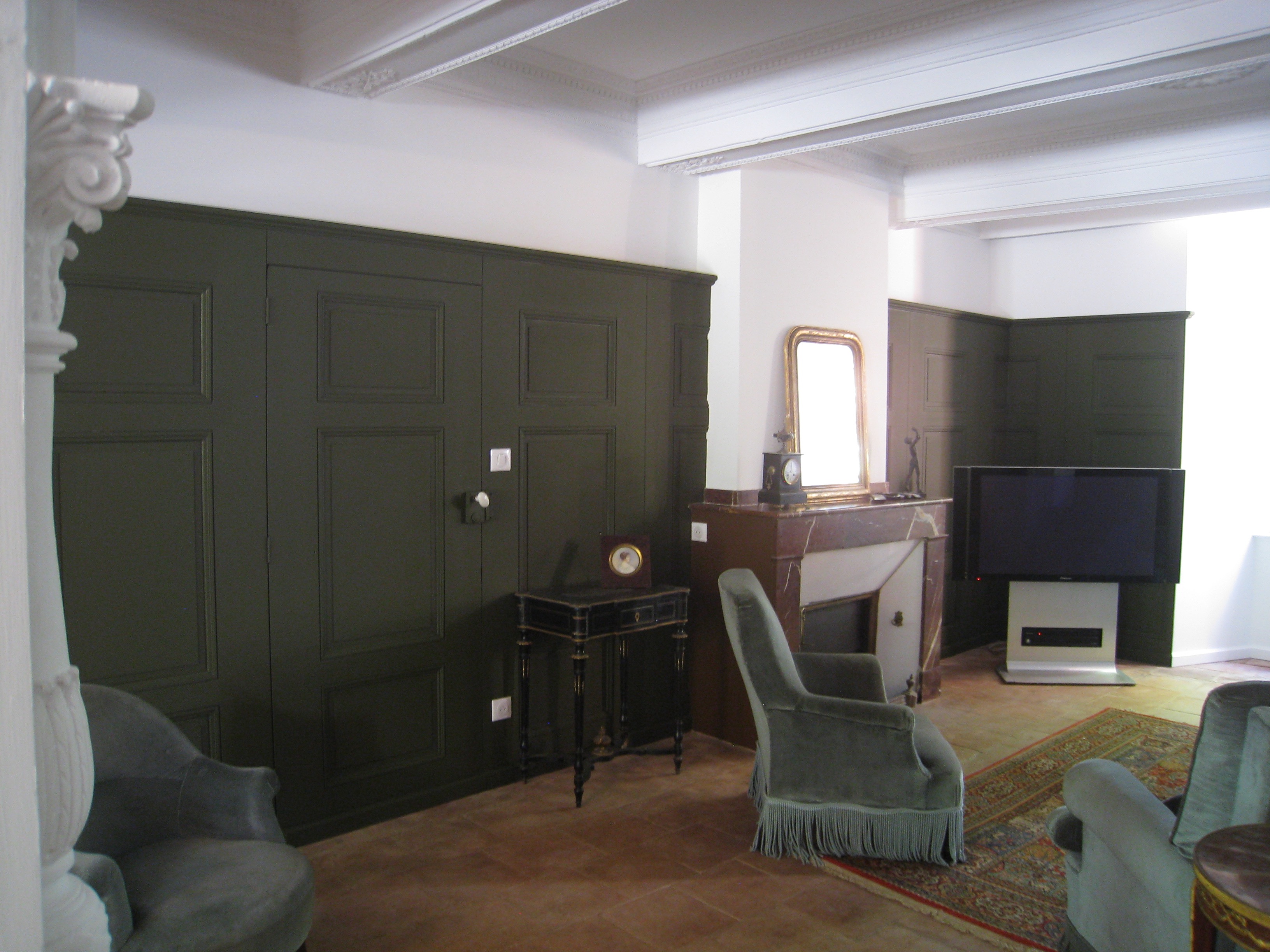 Aprés avoir enlevé le tissus tendu, nous découvrons l ancienne tapisserie et des murs trés abimés, l option de panneaux décoratifs en bois est prise pour laisser respirer les vieux murs.