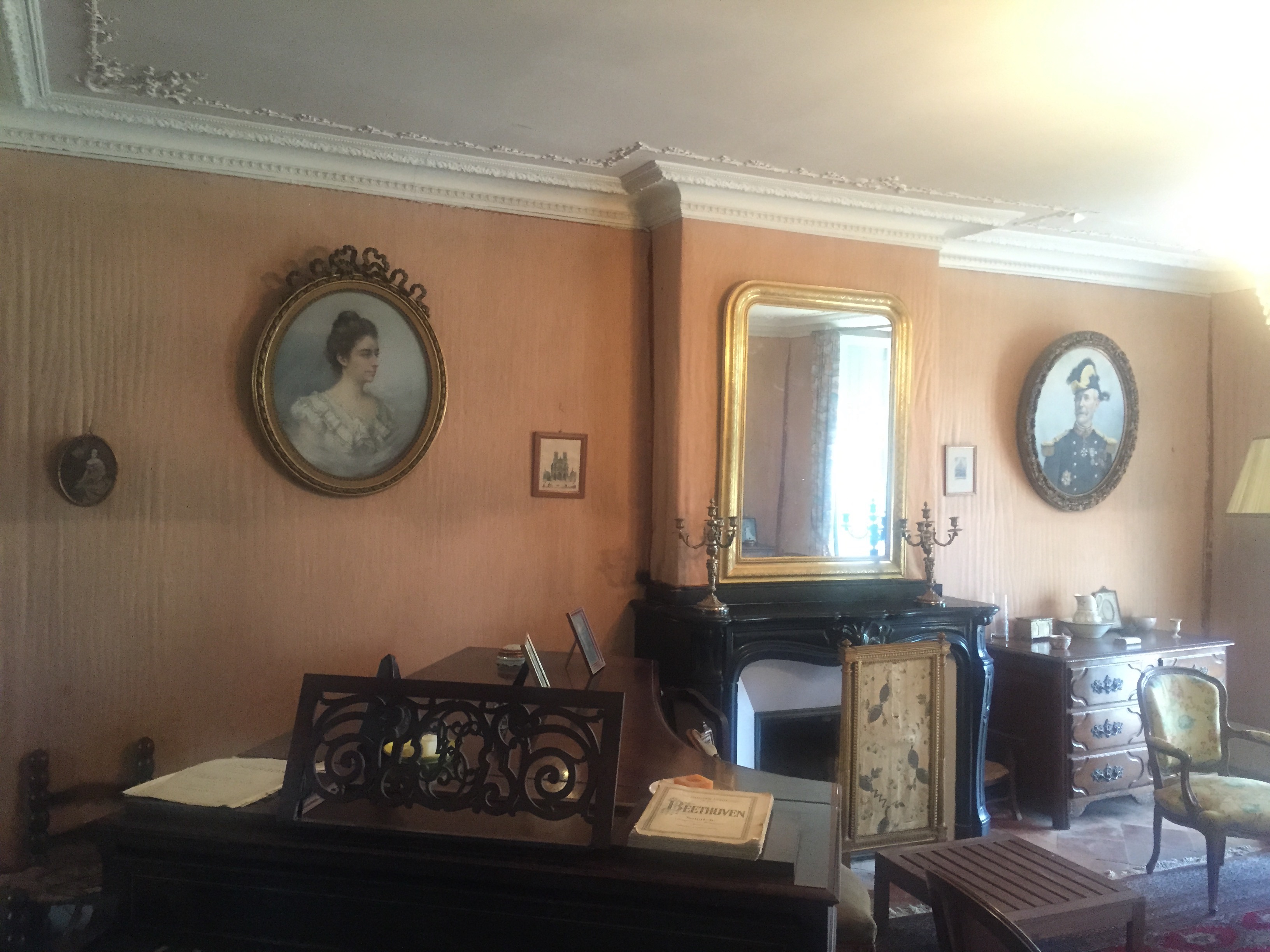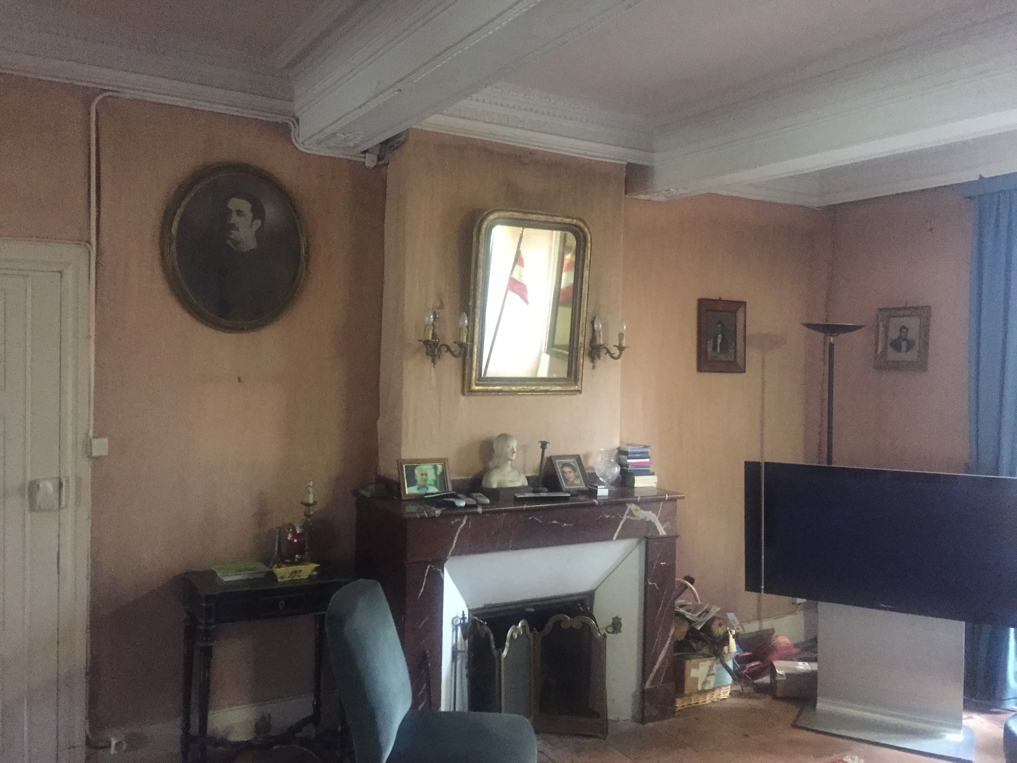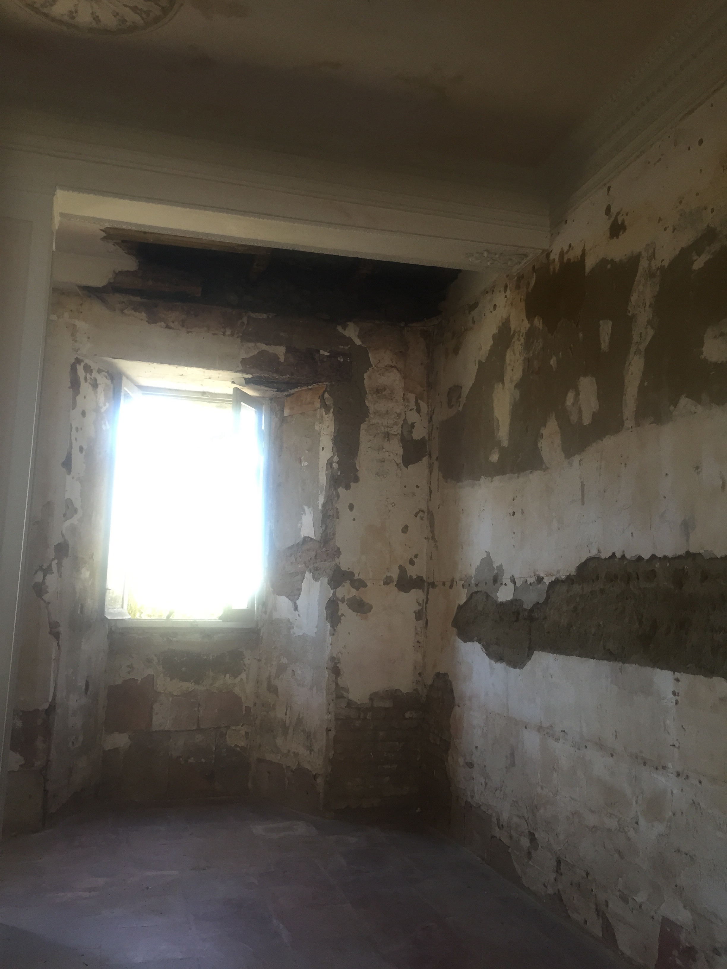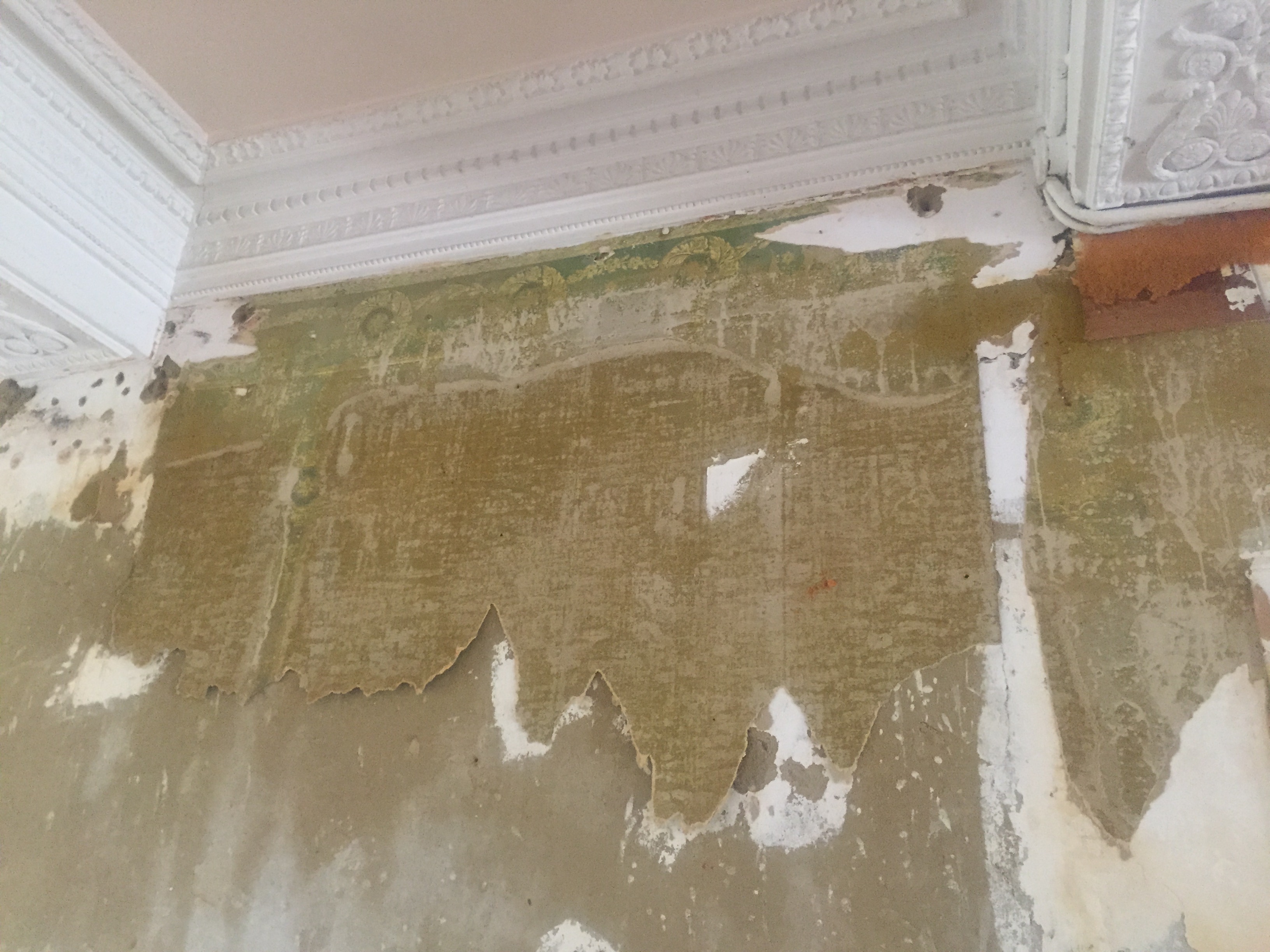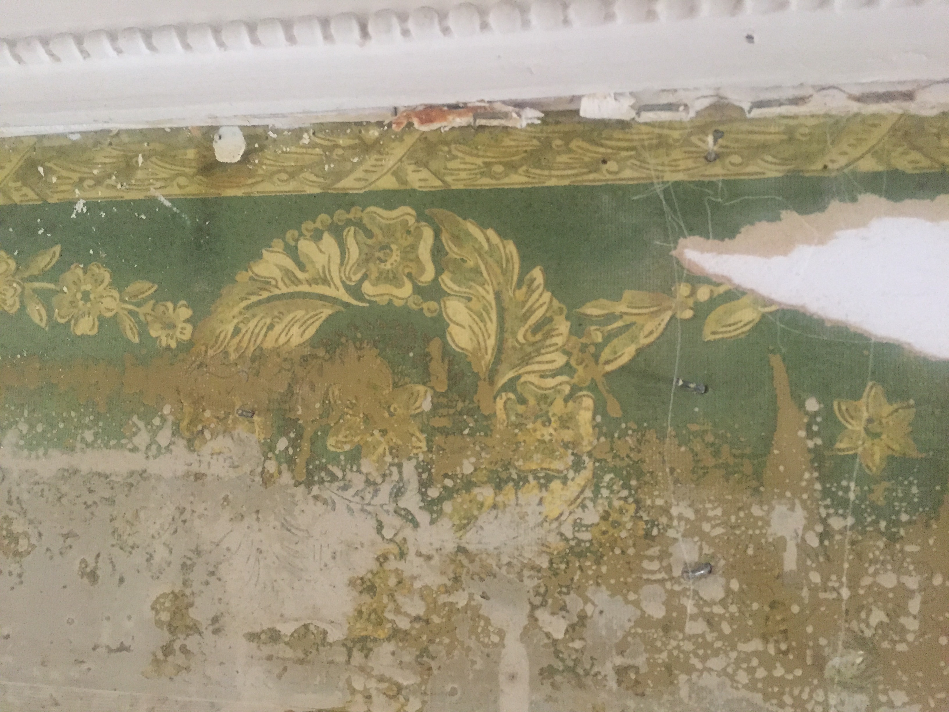 Aprés avoir enlevé le tissus tendu, nous découvrons l ancienne tapisserie et des murs trés abimés, l option de panneaux décoratifs en bois est prise pour laisser respirer les vieux murs.