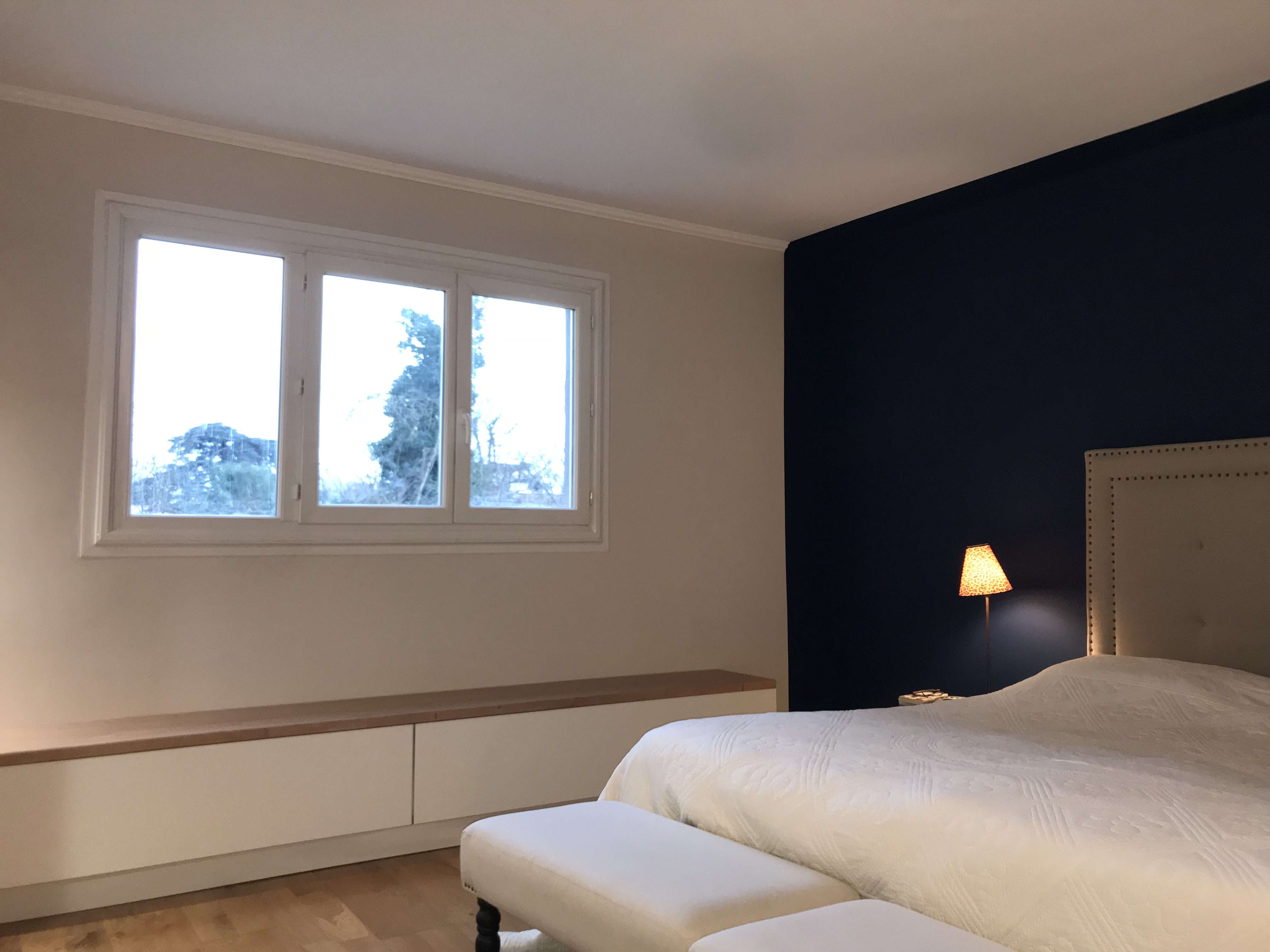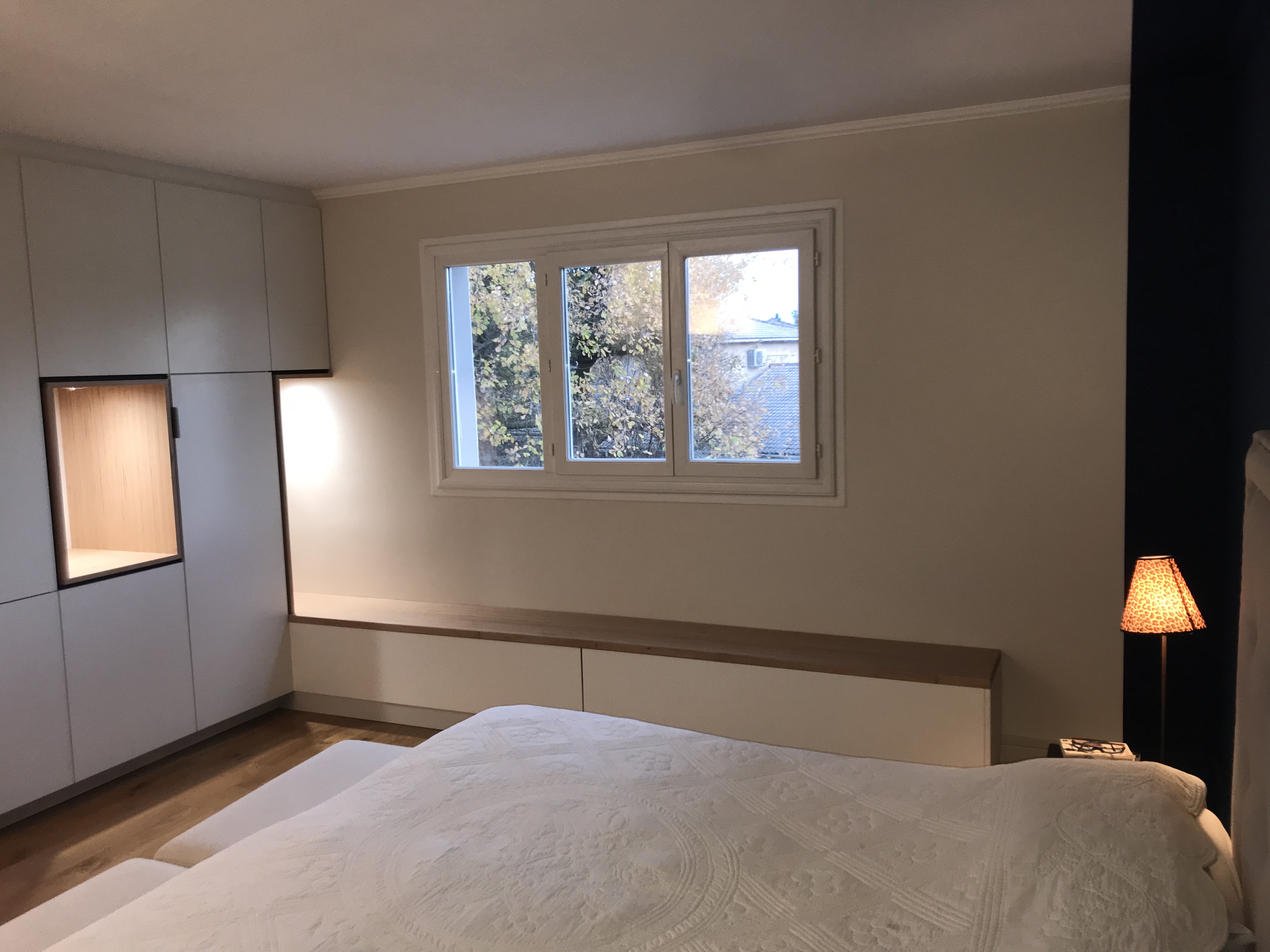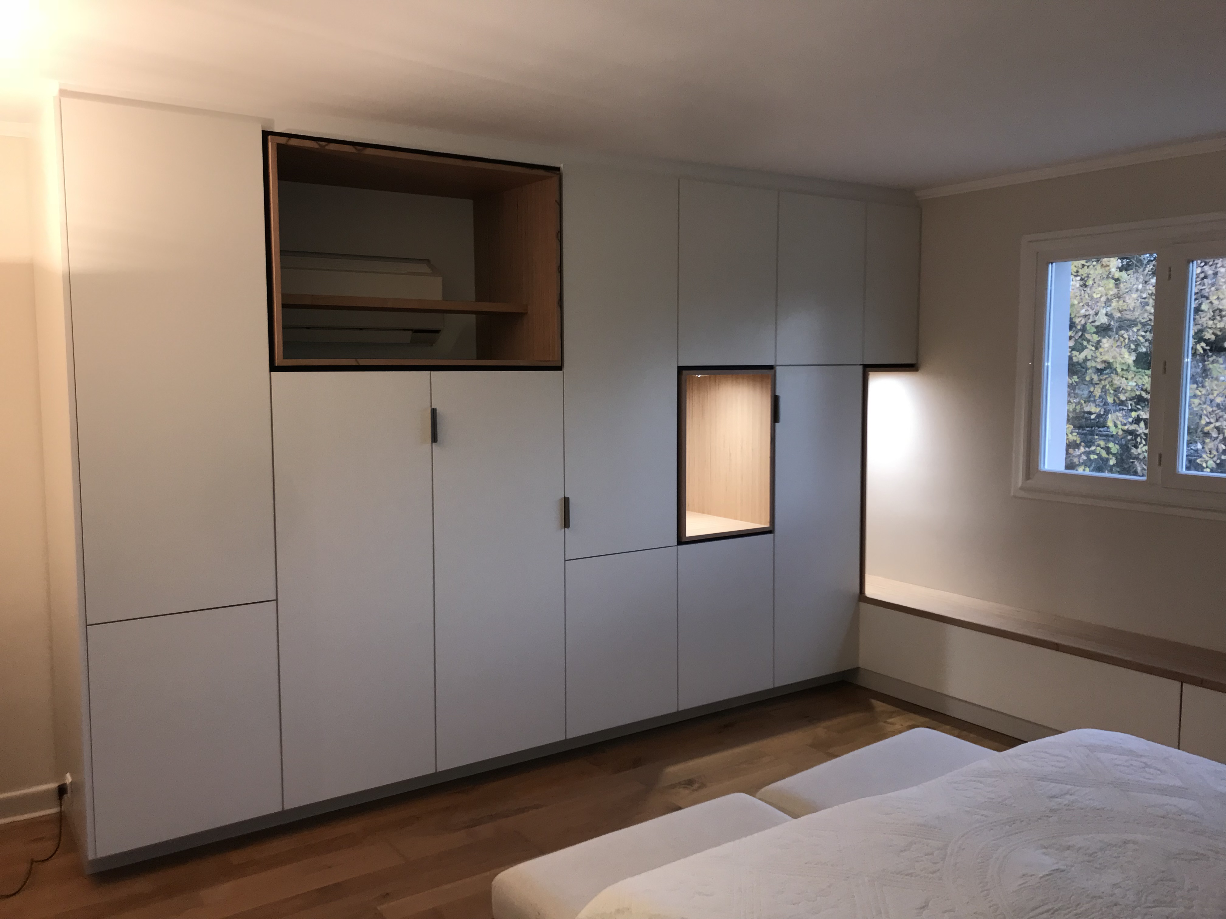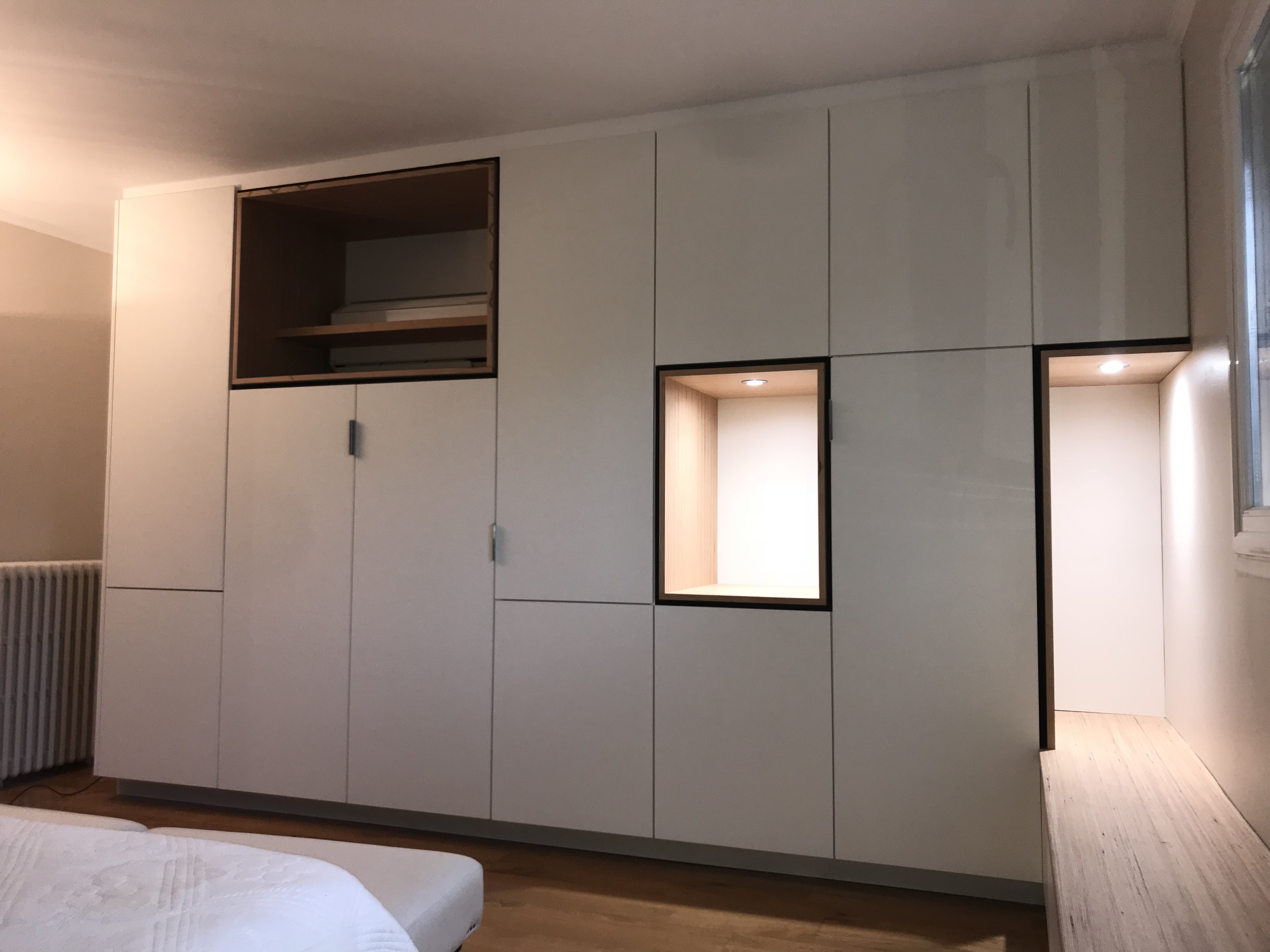 Pour le rafraîchissement de cette chambre où un caisson était vraiment présent et après avoir évoqué le souhait de rangements, il est devenu évident qu'ils ne devaient faire qu'un! Des niches éclairés pour plus de fluidité, du bois brut clair pour un meuble typé scandinave...