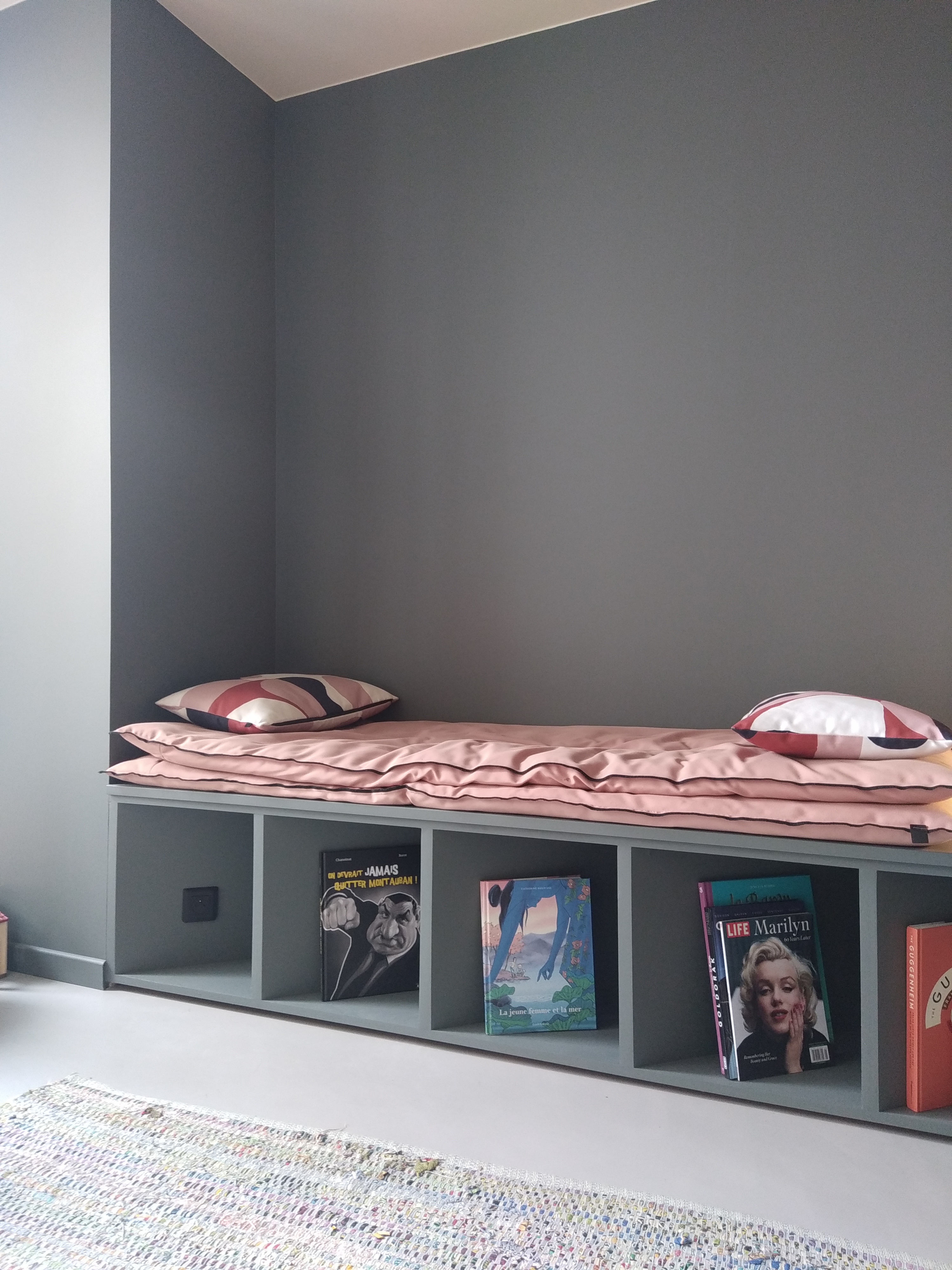 Les niches, les portes en position encastrées rajoutent des lignes & allègent considérablement aussi l'ensemble tout comme cette superbe couleur Ardoise monochrome.